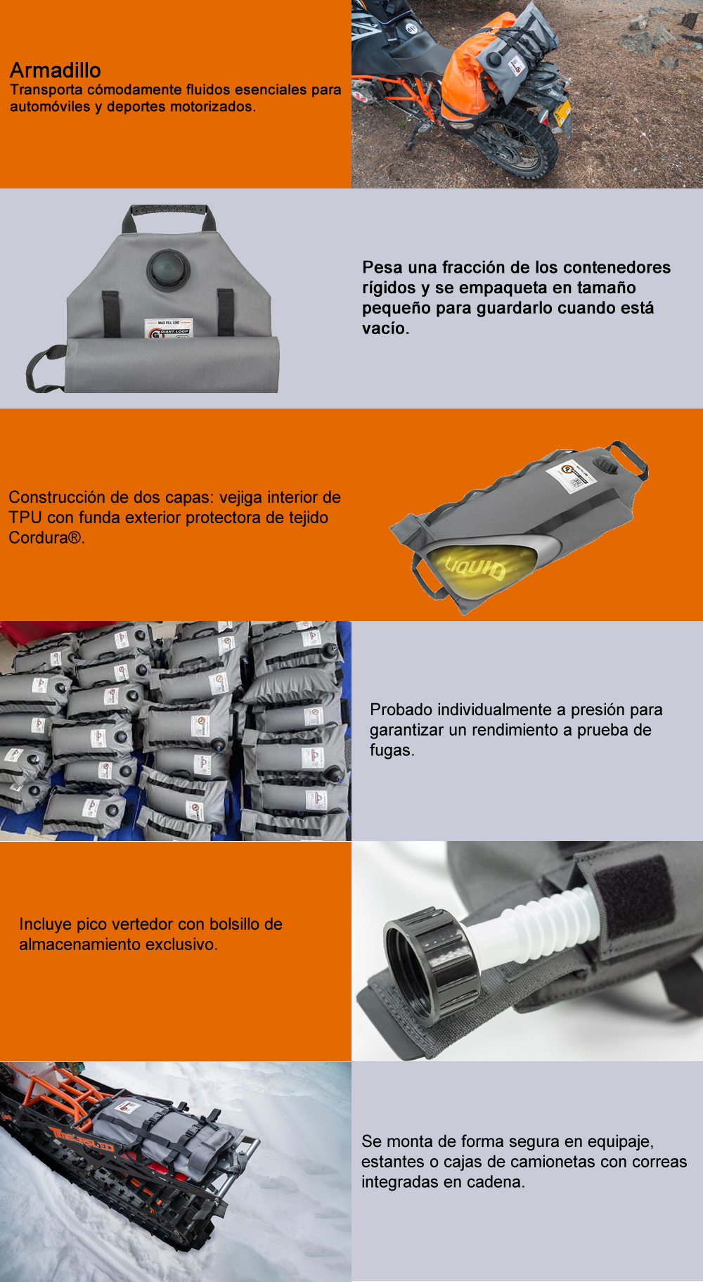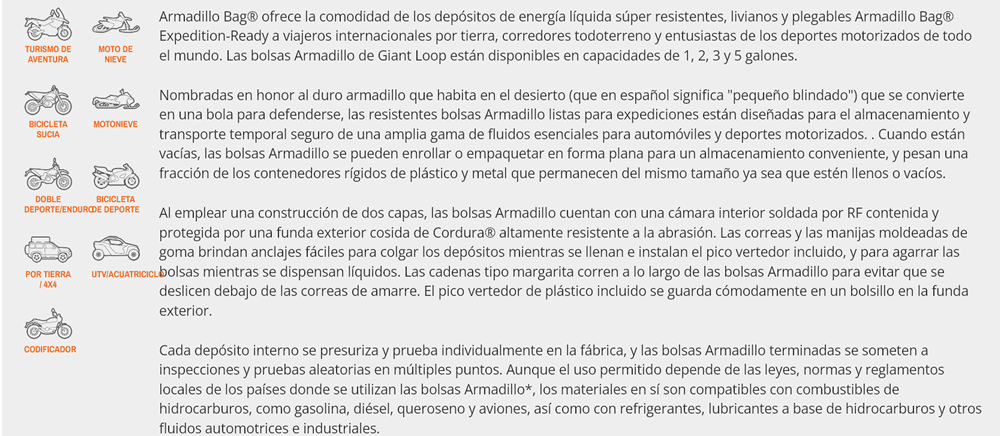 La Giant Loop® Armadillo Bag® está diseñada únicamente para el transporte temporal de deportes motorizados y líquidos automotrices permitidos. La Bolsa Armadillo no es un contenedor portátil o de almacenamiento de combustible a largo plazo como lo describen ASTM, EPA, ARB u otras agencias estatales o federales. Al comprar y llenar este producto, usted acepta que utilizará el producto para el propósito previsto; usted asume toda la responsabilidad por el uso seguro y adecuado de este producto.