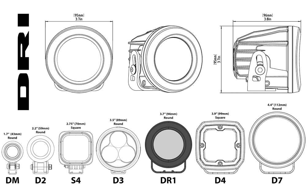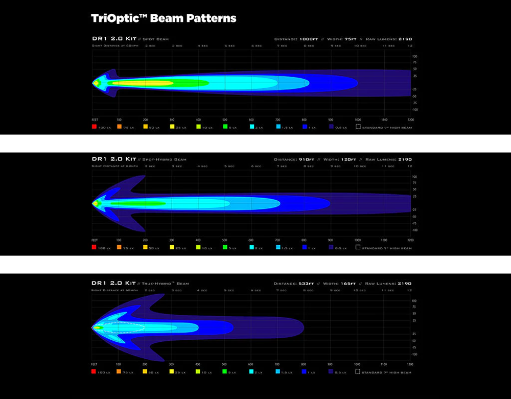 El exclusivo reflector de gran tamaño en el DR1 crea una distancia de haz de 1000 pies líder en la industria desde el único par de LED de 10 vatios. Ningún otro LED de 10 vatios se le acerca. El DR1 es ideal para condiciones de conducción nocturna donde se desea la máxima distancia de haz. El par de lentes True-Hybrid™ incluido cuenta con una certificación oficial E-Mark y crea una combinación más equilibrada de distancia y amplitud.