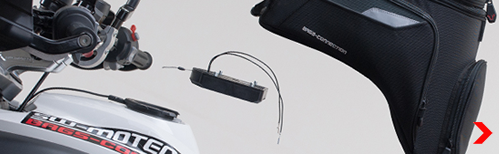 Bolsa de Depósito Eléctrica QUICK-LOCK EVO, equipada con un anillo superior eléctrico. El adaptador SAE permite una variedad de opciones de conexión. Esto posibilita la provisión de electricidad a la bolsa directamente de la batería de la moto. Fijada con un mecanismo de interruptor patentado, la electricidad solo fluye si la bolsa de depósito está fijada. La electricidad se corta inmediatamente en cuanto se desmonta la bolsa de depósito del anillo de depósito.